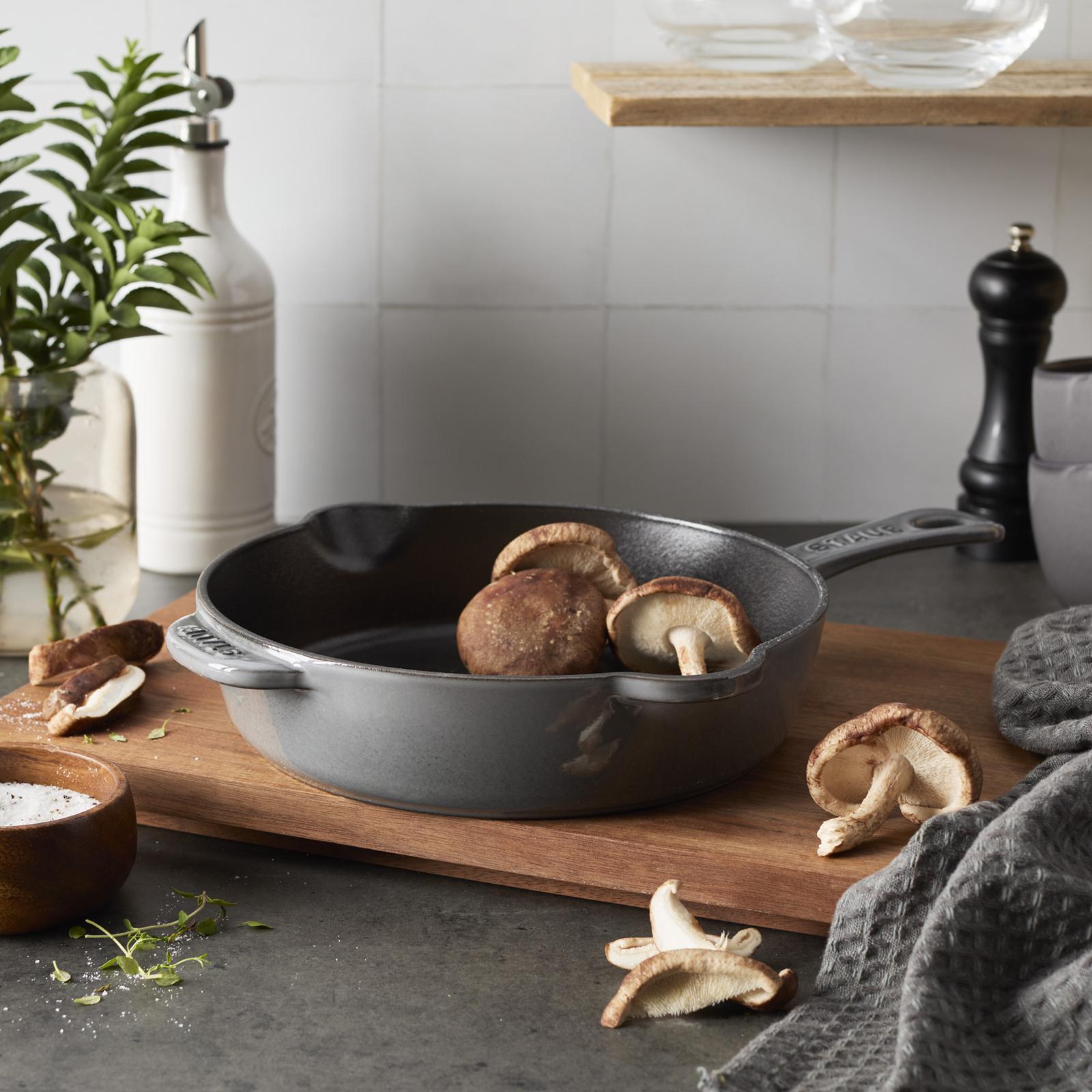Proudly made in France, Staub has been the benchmark for premium cast iron cookware. Like all Staub fry pans, the Staub Traditional Skillet browns foods beautifully. Whether you’re searing chicken breasts, frying bacon, or caramelizing carrots, the Staub interior imparts texture, promoting exceptional browning and searing, without sticking. And because cast iron offers steady, even heat distribution, the temperature of the pan won't drop as you cook. Like a sauté pan and fry pan in one, our Traditional Skillet boasts all the features of a fry pan combined with higher, straighter sides, which means less splatter on the stovetop. Staub enameled cast iron cookware is the choice of the world's best chefs. With exceptional durability, it’s perfect for day-to-day use in both gourmet home kitchens and prestigious restaurants around the world. Each piece transitions beautifully from the kitchen to the table. Built to last a lifetime, these heirloom pieces can be passed from generation to generation. Textured interior ensures exceptional browning. Enameled cast iron is easy to clean and doesn’t require seasoning. Durable cast iron construction boasts incredible heat retention and distribution. Pouring spouts for easy fat removal. Raised sides help prevent splatter and spills.