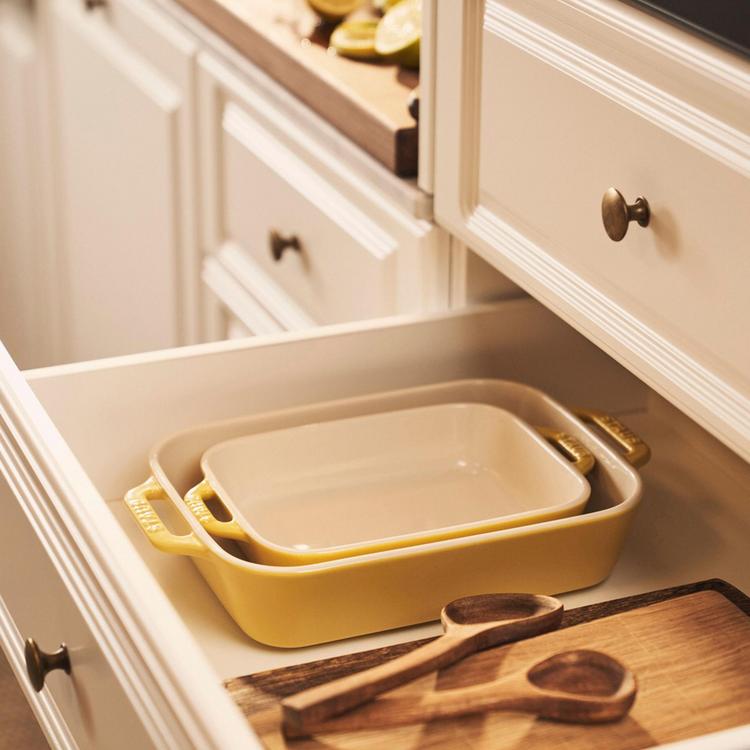 Capturing the joy of sunny springtime days, Citron is cheerful and charming, transforming every meal into a warm, carefree moment. Bold and bright, it stands alone on any tabletop or perfectly pairs with other shades of Staub. Staub rectangular stoneware bakers gently retain heat and won't absorb moisture, producing a delicious result for all your favorite dishes. The stackable 2-pack baking dishes are perfect for lasagna, casseroles, desserts, as well as roasted meats and vegetables. This baking dish set transitions beautifully from oven to table.