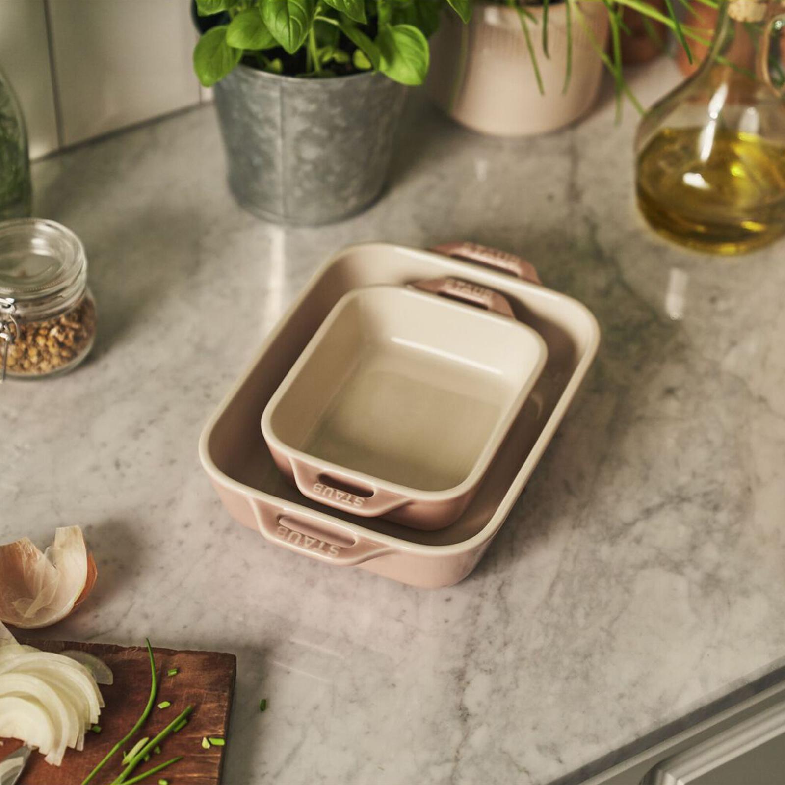 Capturing the joy of sunny springtime days, Citron is cheerful and charming, transforming every meal into a warm, carefree moment. Bold and bright, it stands alone on any tabletop or perfectly pairs with other shades of Staub. Staub rectangular stoneware bakers gently retain heat and won't absorb moisture, producing a delicious result for all your favorite dishes. The stackable 2-pack baking dishes are perfect for lasagna, casseroles, desserts, as well as roasted meats and vegetables. This baking dish set transitions beautifully from oven to table.