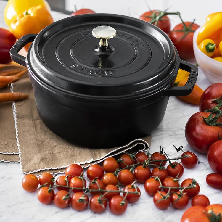 The Staub cocotte is unsurpassed for slow-cooking meats and vegetables to tender perfection, and for simmering hearty stews and soups. Cast iron possesses exceptional heat-retaining qualities, so the pot heats evenly throughout. The innovative lid features tiny spikes on the interior that continually release condensed liquid back onto the food, yielding moist, flavorful results.Staub's special matte black enamel interior and self-basting spiked lid guarantee perfect browning and braising for flavor-enhanced food. With their exquisite enamel finish, each piece transitions beautifully from the kitchen to the table. From comfort food to sumptuous suppers, every dish is special when served in Staub.Staub enameled cast iron cookware is the choice of the world's best chefs. With exceptional durability, it is perfect for day-to-day use in both gourmet home kitchens and prestigious restaurants around the world. Built to last a lifetime, these heirloom pieces can be passed from generation to generation. Made in France. Heavy weight, tight-fitting lid retains moisture, spikes on the lid create a rain-forest effect evenly returning juices back onto food. Oven safe up to 900F/482C without lid, Lids are oven safe up to 500F/260C. Nickel steel knob. Smooth enamel bottom works on all stovetops, including gas, electric, glass, ceramic, induction, and halogen. Unique, interior matte texture results in exceptional browning.