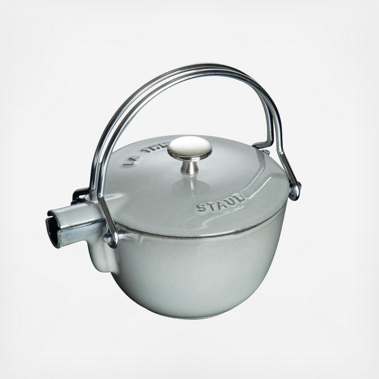 An instant conversation piece! Just right for tea, hot water, soup, and other one-pot classics, Staub's innovative 1 qt. tea kettle is a multi-functional wonder for today's contemporary kitchen. With the even heat distribution and heat retention that only enameled cast iron can offer, contents stay hotter longer, plus the kettle is highly chip-resistant and resists discoloration.