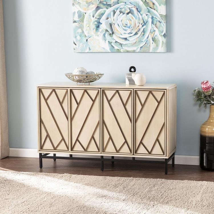 Bring home a modern take on 1930s chic with this sleek four-door storage buffet. Sized just right for an entryway credenza or media console under your wall-mounted TV, this anywhere cabinet supplies ample storage for everything from fine china to your gaming collection, all while serving up classic art deco style with a high constrast twist. Tidy up in black and white with this two-tone accent cabinet greeting guests in the foyer, dishing up a dinner buffet in the dining room, or supplying extra linens in the hall.