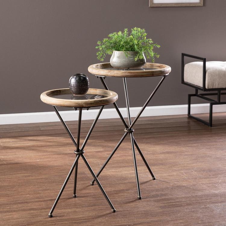 Add rustic charm to your living space with this round accent table set. Glass tabletops elegantly display farmhouse décor or hold a reading lamp and your favorite book, while unique tripod legs bring a sleek, industrial feel to your home. Perfect for any small space, these modern side tables work beautifully as plant stands in your entryway or as a convenient place to set your drink in your family den. Bring sophisticated style to your farmhouse design with this two-piece table set.