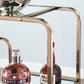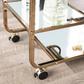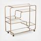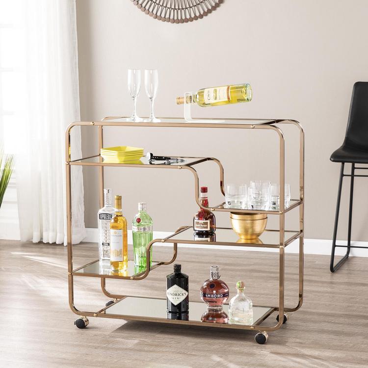 Bring out your bubbly with this champagne finished mobile bar cart. With fluid, asymmetrical appeal, this coffee cart's metal framework adds a midcentury modern aesthetic. From morning java to happy hour, ample storage reflects your beverage of choice. Go with the flow of the party by using this mobile cart in your living room, dining room, or kitchen.