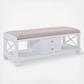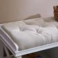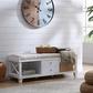 Transition to farmhouse style with this welcoming entryway storage bench. Comfy, tufted, taupe cushion provides dining or window seating for you and yours. Two drawers open storage for entertaining accessories or entryway necessities, while open shelving tidies stacks of shoes or plates. The crisp white finish blends with any collection, adding charming seating to your space. For added storage and style, sit this upholstered bench in your entry or dressing area.