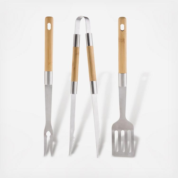 Made of Stainless Steel with bamboo handles, this set is a must for your favorite grill master! Tools measure 18 1/2" Long.