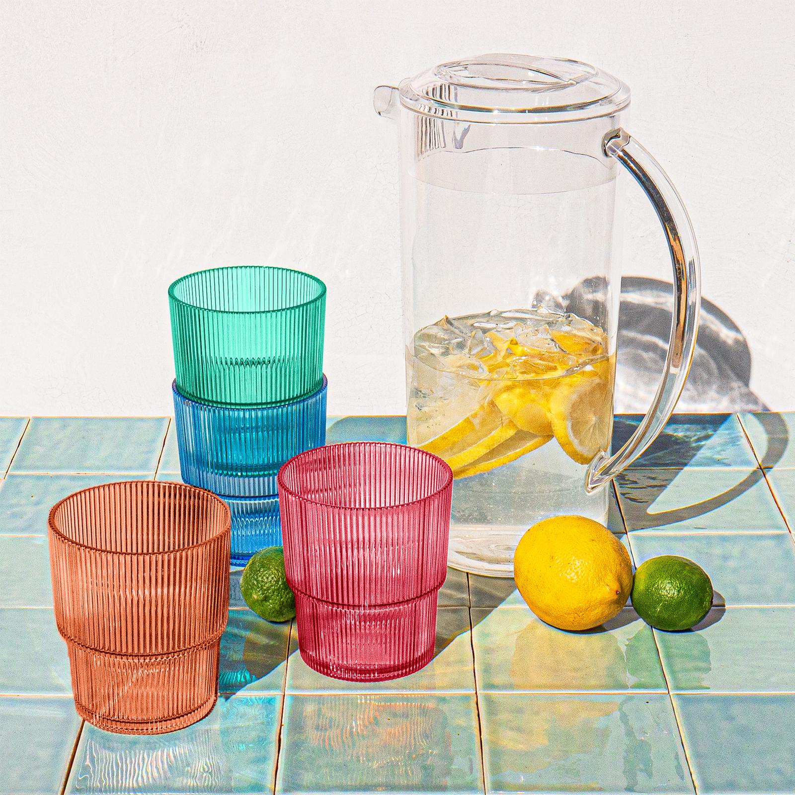 Serve up refreshment with ease using the Fine Rib & Pitcher Set! This convenient set includes a 91 oz pitcher and four 16 oz ribbed glasses in assorted colors, perfect for entertaining or everyday use. BPA Free.