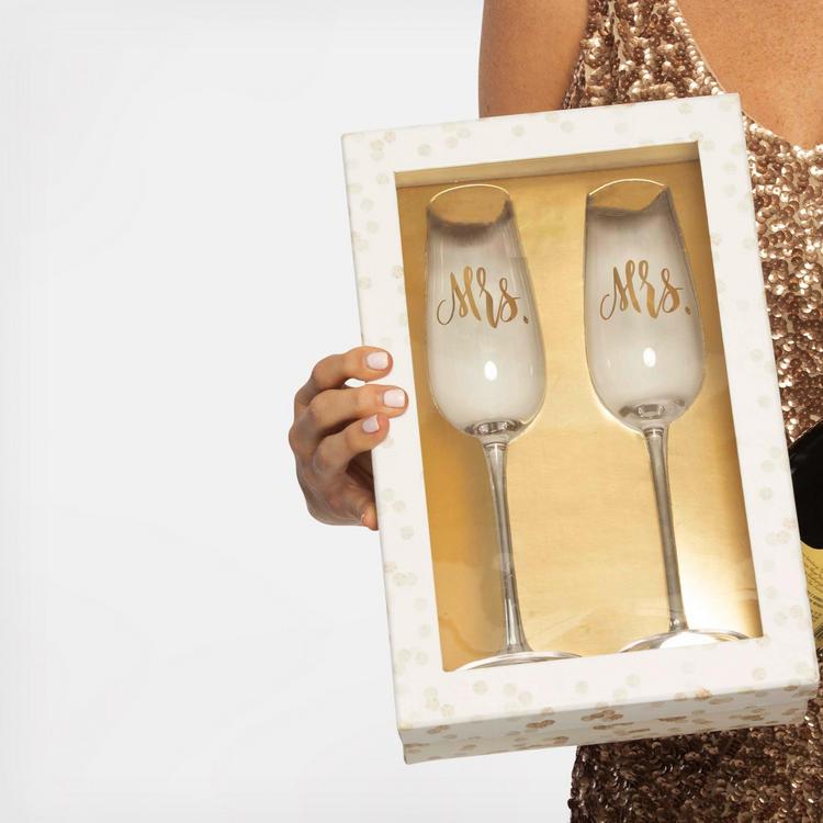 These gorgeous toasting glasses are etched with Mrs. & Mrs. in gold metallic. They ship in a beautiful gift box, which reads “a toast to the brides” across the back. These glasses would make the perfect shower gift!