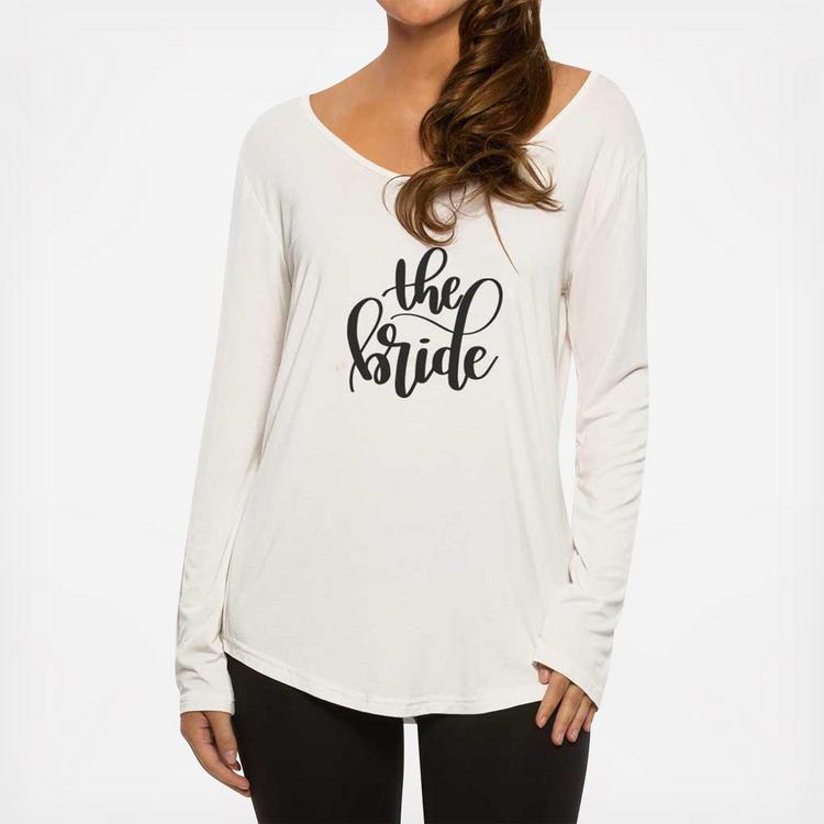 The Bride Long Sleeve T-Shirt features pretty calligraphy script on the softest, most comfortable shirt you’ll ever own. This shirt for the bride to be has an easy to wear, drapey fit.