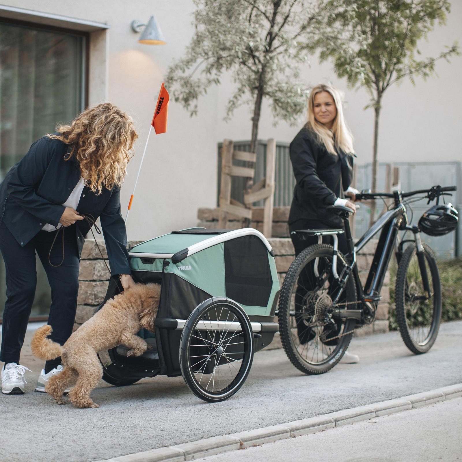 Dog bike trailer perfect for adventures with your dog. Designed for dog comfort. Taking your dog on adventures or errands with you has never been easier. The Thule Bexey dog bike trailer provides your furry friend with the ultimate comfort and safety, no matter where the trail may lead.