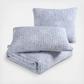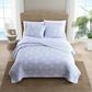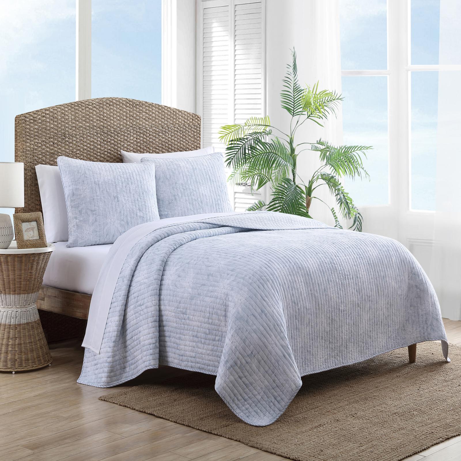 Inspired by Hawaii's lush islands, Makena quilt features a muted floral print on a blue ground. The reverse is blue. This quilt is lightweight and easy to layer. The shams feature a two piece back closure. The corners of the quilt are rounded to match the sham, both edges are finished with a fabric binding. This quilt set is fully reversible.
