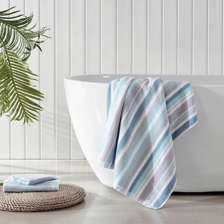 The Ocean Bay stripe towels features island-inspired color palette on soft and luxurious yarn dyed plush cotton. These towels have a substantial 600 gsm and durable two ply combed yarns. The products are crafted with you in mind, this towel is standard 100 by oeko-tex certification- tested against a list of 350 harmful substancess, resulting in a chemical free item.