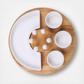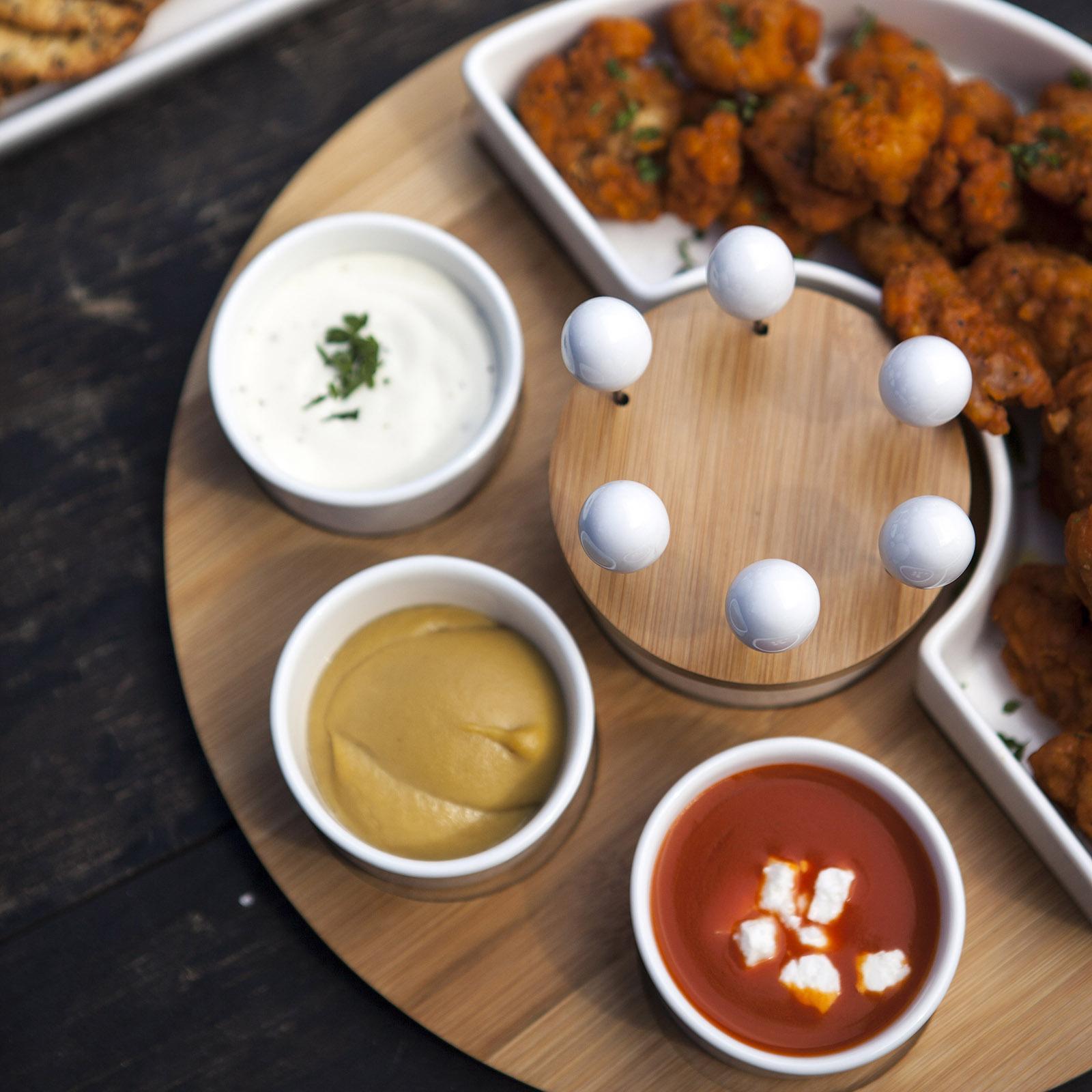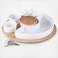 Make your dinner party sing with the Symphony Appetizer Serving Set. This serving platter features a large C-shaped ceramic bowl that is ideal for wings and meatballs. Remove the center bowl to make this party tray look like a smiley face!