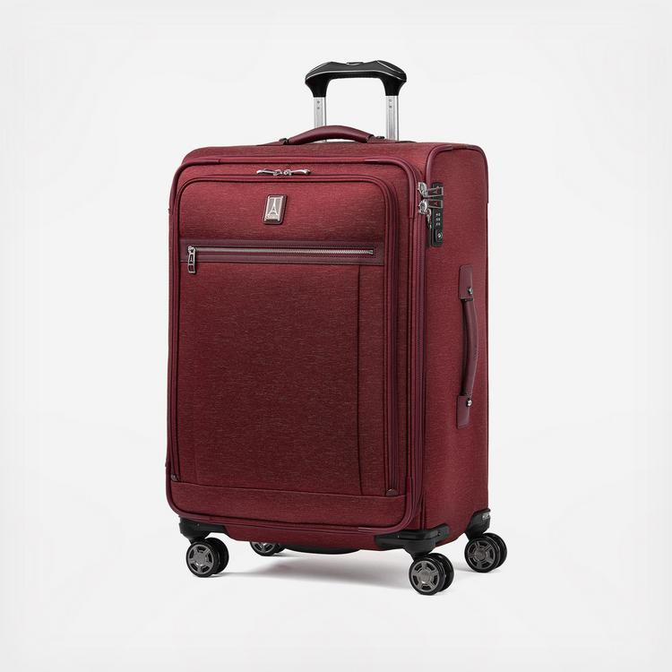 This great-looking, functional and durable Platinum® Elite 25” Expandable Spinner is ideal for medium and long trips and includes all the amenities you need, like a built-in suiter that helps guard against wrinkles and a deluxe tie-down system with integrated accessory pockets that keeps all your items well organized and securely stowed. Crafted with premium fabrics, leather accents and chrome zippers, this handsome bag also includes a tip-resistant tapered expansion feature that provides up to 2 inches of additional packing space, and an integrated, TSA-compliant lockthat keeps contents secure while allowing inspection authorities to access the suitcase without damaging it. For effortless mobility, this suitcase is also equipped with the PrecisionGlide™ system, comprised of eight MagnaTrac® self-aligning 360° spinner wheels, and an adjustable PowerScope extension handle with a patented, ergonomically-designed rubberized Contour Grip for easy handling. Backed by Travelpro’s Built for a Lifetime Limited Worry-Free Warranty