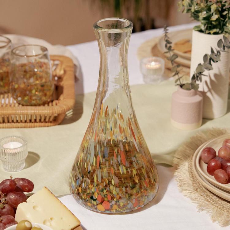 A riot of color makes this dazzling wine decanter stand out. Handblown by Mexican artisans from recycled glass, this speckled glassware makes wine or batch cocktails shine.