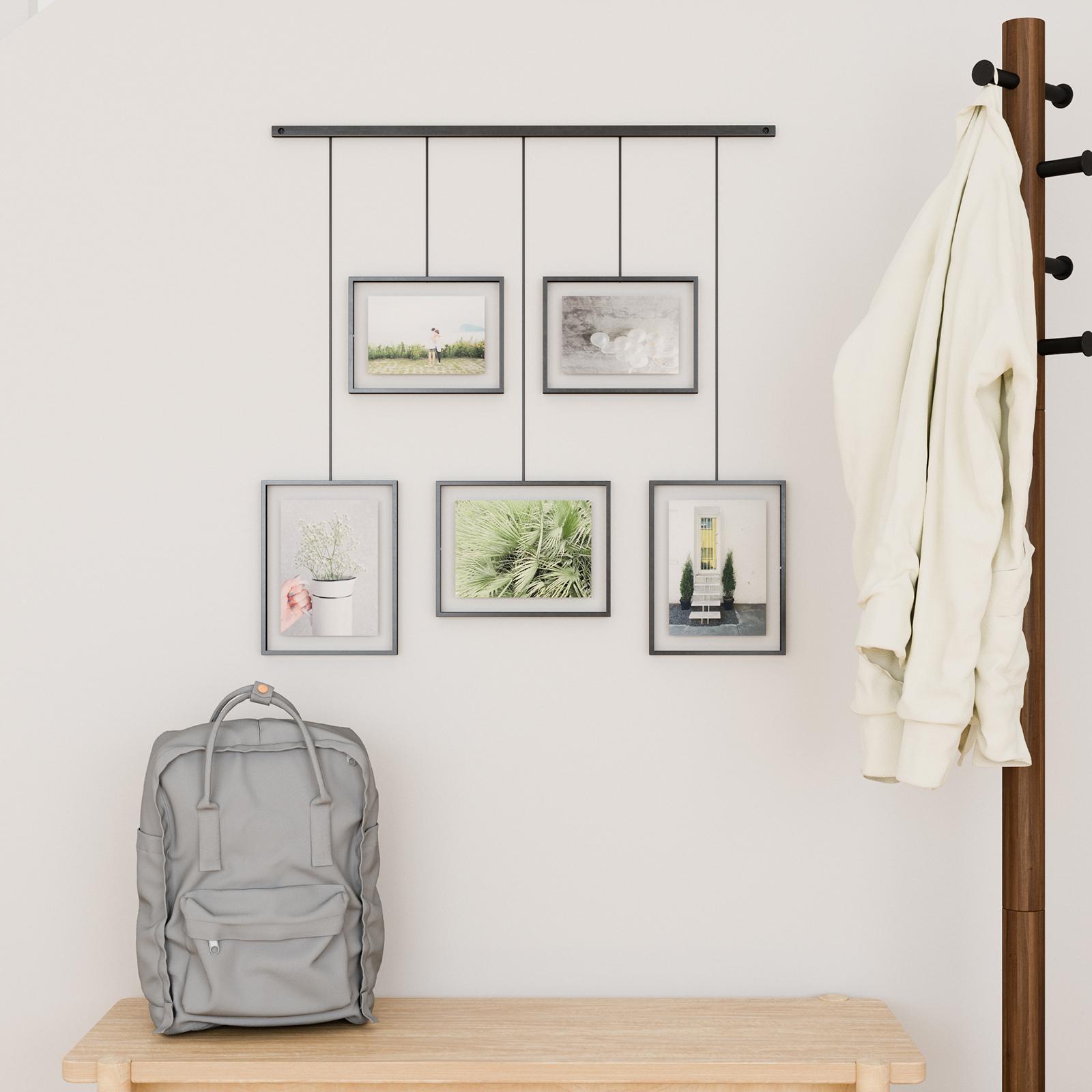 Exhibit Photo Display features a wall-mounted brushed metal ledge with clips and brackets to hold five gallery-style picture frames of various size, all while reducing the amount of damage typically left on walls. The brackets with the frames are suspended from the ledge, which allows them to be moved around to create various layouts. Its flexible horizontal hanging properties make Exhibit a great addition to your stairway due to its ability to be hung angled. Use Exhibit to set a decor accent in your living room, bedroom, entryway, office or studio and give it a modern update while curating your favorite photos and artwork. Exhibit is customizable to your layout preference. The picture frames can be moved around the metal ledge and rotated to a landscape or portrait orientation. Exhibit features two 4x6 and three 5x7 picture frames to fit all of your favorite photos, artwork, illustrations and more. Complementary to multiple decor styles, Exhibit makes is a beautiful wall decor piece that allows you to change out images easily to refresh your room any time you want.