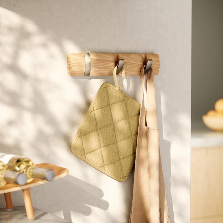 Flip is a modern yet functional, wall mounted coat rack with ample hanging space where you need it most. Flip boasts a clever design with multiple hooks that retract when not in use, each one slipping neatly back into its groove for a sleek look and space-saving functionality. But don’t let the compact look fool you, because Flip can accommodate a surprisingly large number of items making it the perfect spot to hang coats, scarves, purses, and more for you, your family and your guests. Thanks to the sleek profile and hidden mounting hardware, Flip mounts seamlessly to virtually any wall and offers styling that looks great in any entryway or foyer, regardless of how big or small it is. Sourced from renewable wood sources.