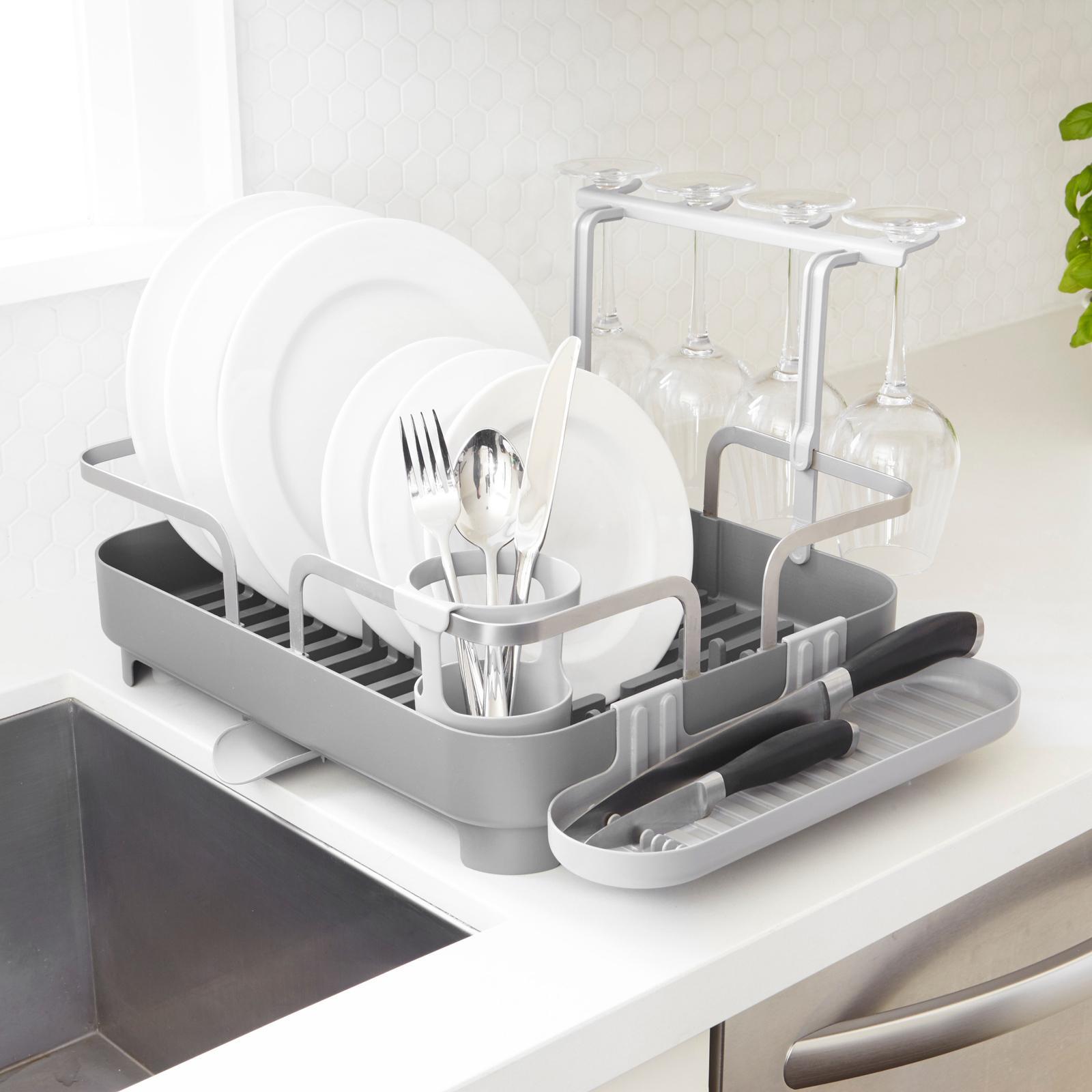 This dish rack is made of molded plastic and has a stainless-steel frame making it both durable and easy to clean. Holster has a 15-plate capacity, utensil storage, moveable stemware holder, a multi-purpose side tray and dual position drain spot. With soft, curved lines, this low profile, molded plastic caddy is a modern but approachable piece for everyday kitchen use.