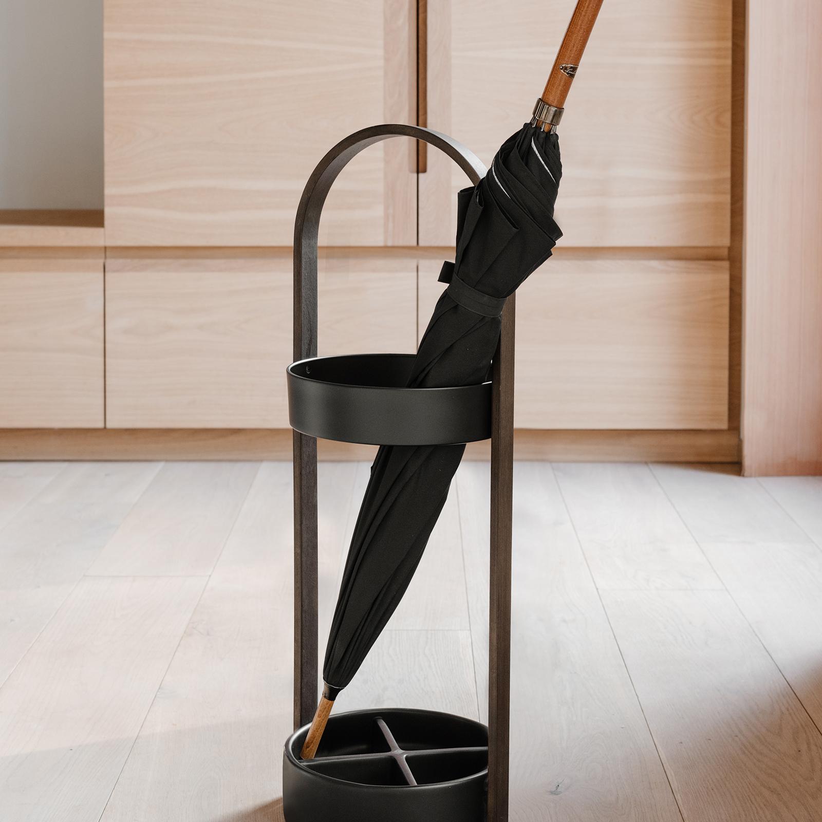 The Bellwood Umbrella Stand is durable as it is stylish thanks to its beautiful and shape and resin base, which is water-resistant and prevents rusting. Featuring a round base and a curved wood veneer handle with an upper ring made of steel. This piece is easy to assemble and includes all hardware. Its slots will hold your tall umbrellas with ease and its tiny hooks on the top of the ring will hold your more compact, short umbrellas. Measuring 8.75 dia. x 27 in., this stylish piece will fit neatly into many different spaces and styles of décor.