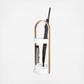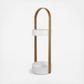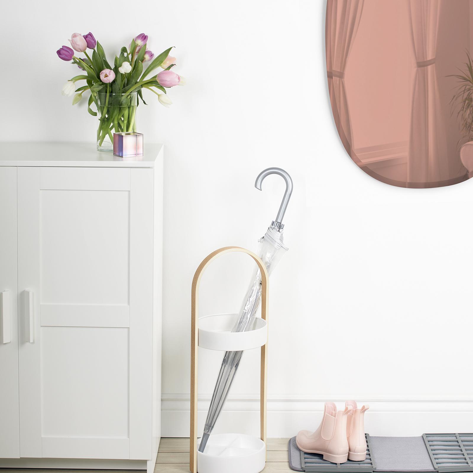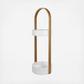 The Bellwood Umbrella Stand is durable as it is stylish thanks to its beautiful and shape and resin base, which is water-resistant and prevents rusting. Featuring a round base and a curved wood veneer handle with an upper ring made of steel. This piece is easy to assemble and includes all hardware. Its slots will hold your tall umbrellas with ease and its tiny hooks on the top of the ring will hold your more compact, short umbrellas. Measuring 8.75 dia. x 27 in., this stylish piece will fit neatly into many different spaces and styles of décor.
