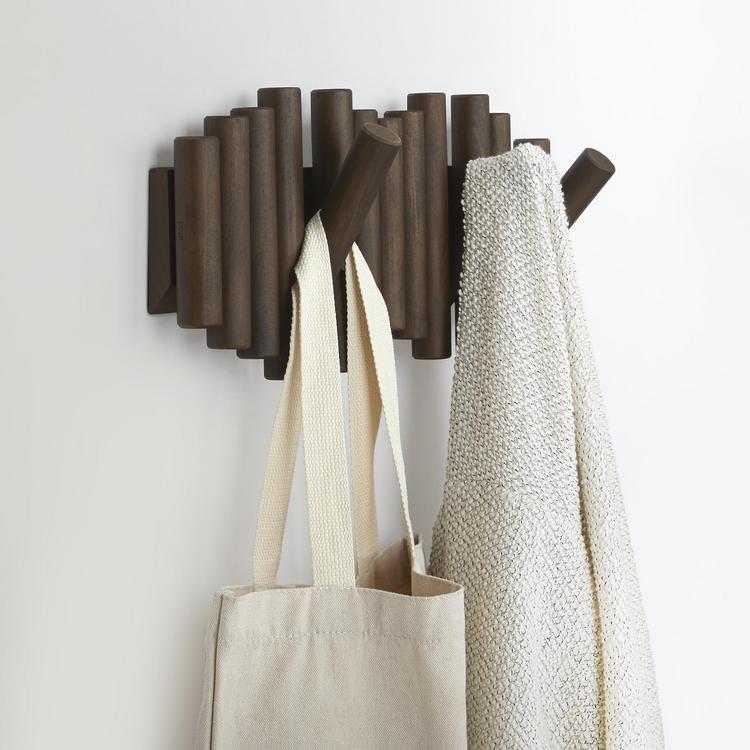 Add a stylish touch to any room in your home with the Umbra Picket Wall Hook. This wall hook has a unique design that looks almost like a piece of wall art with its beautiful shape and beveled pine wood dowels. Picket has five hooks that flip down when needed to easily hold up to 5 lbs. each. When not in use, the hooks can flip back up, creating a seamless profile that makes Picket look like an interesting piece of art. Hang multiple pickets side by side to create an even more eye-catching statement on your wall. Easy to mount, this stylish and functional hook includes all the necessary mounting hardware and instructions for a quick and easy installation. Whether you're looking to hang your coats and bags in the entryway, or jewelry and accessories in your bedroom, the Umbra Picket Wall Hook is the perfect accent piece to any room. Because wood is a natural finish, each Picket Rail Hook is unique and may slightly differ in grain.