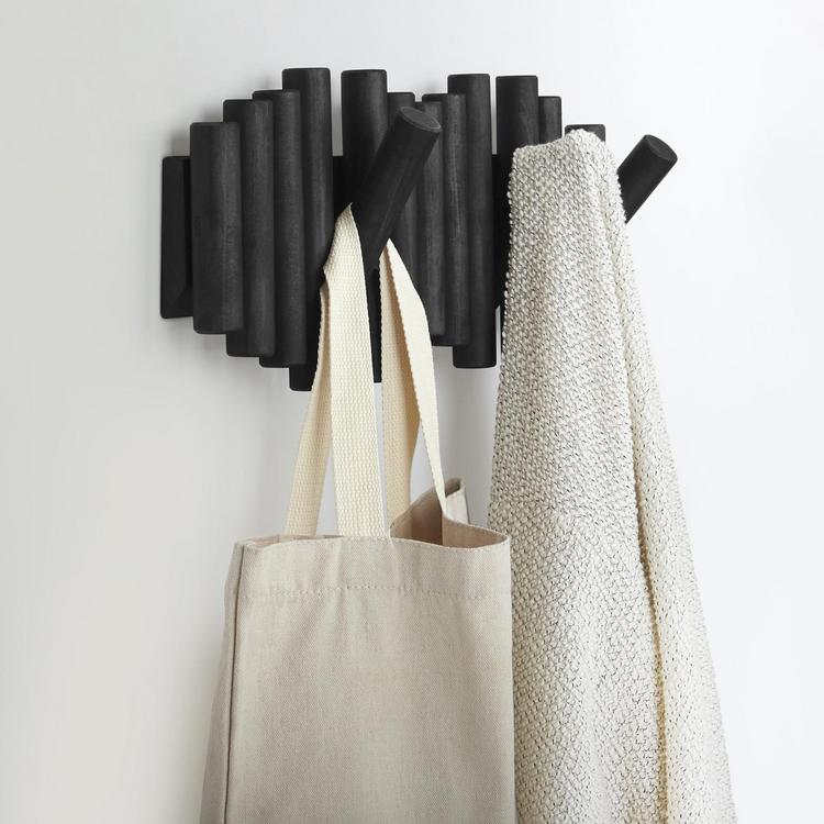 Add a stylish touch to any room in your home with the Umbra Picket Wall Hook. This wall hook has a unique design that looks almost like a piece of wall art with its beautiful shape and beveled pine wood dowels. Picket has five hooks that flip down when needed to easily hold up to 5 lbs. each. When not in use, the hooks can flip back up, creating a seamless profile that makes Picket look like an interesting piece of art. Hang multiple pickets side by side to create an even more eye-catching statement on your wall. Easy to mount, this stylish and functional hook includes all the necessary mounting hardware and instructions for a quick and easy installation. Whether you're looking to hang your coats and bags in the entryway, or jewelry and accessories in your bedroom, the Umbra Picket Wall Hook is the perfect accent piece to any room. Because wood is a natural finish, each Picket Rail Hook is unique and may slightly differ in grain.