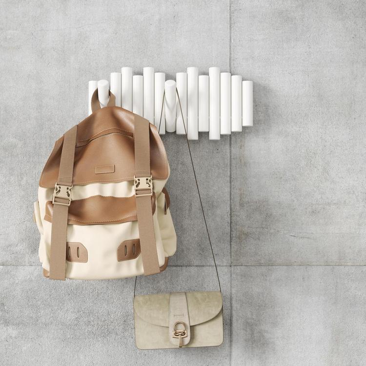 Add a stylish touch to any room in your home with the Umbra Picket Wall Hook. This wall hook has a unique design that looks almost like a piece of wall art with its beautiful shape and beveled pine wood dowels. Picket has five hooks that flip down when needed to easily hold up to 5 lbs. each. When not in use, the hooks can flip back up, creating a seamless profile that makes Picket look like an interesting piece of art. Hang multiple pickets side by side to create an even more eye-catching statement on your wall. Easy to mount, this stylish and functional hook includes all the necessary mounting hardware and instructions for a quick and easy installation. Whether you're looking to hang your coats and bags in the entryway, or jewelry and accessories in your bedroom, the Umbra Picket Wall Hook is the perfect accent piece to any room. Because wood is a natural finish, each Picket Rail Hook is unique and may slightly differ in grain.