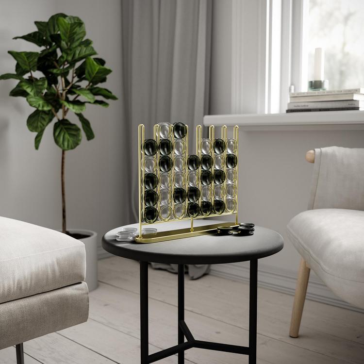 A fun game for any occasion, Stax Four-in-a-Row is perfect for all ages. With a metal plated finish and frosted playing pieces, this elevated twist on the classic game also doubles as a unique piece of decor to display in your home. Modern brass metal finish and frosted playing pieces create an eye-catching look on any table or counter space. The metal wire stopper keeps pieces and place and provides a simple, and decorative design.