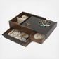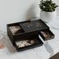 The Stowit is a large jewelry box with hidden storage drawer. The upper drawer has open storage and linen ring pillows, while the lower drawer can store larger necklaces and bracelets.
