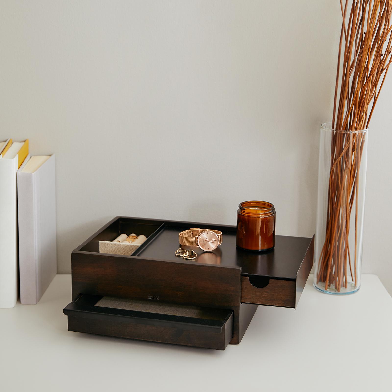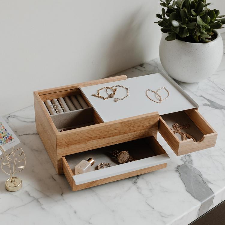 The Stowit is a large jewelry box with hidden storage drawer. The upper drawer has open storage and linen ring pillows, while the lower drawer can store larger necklaces and bracelets.