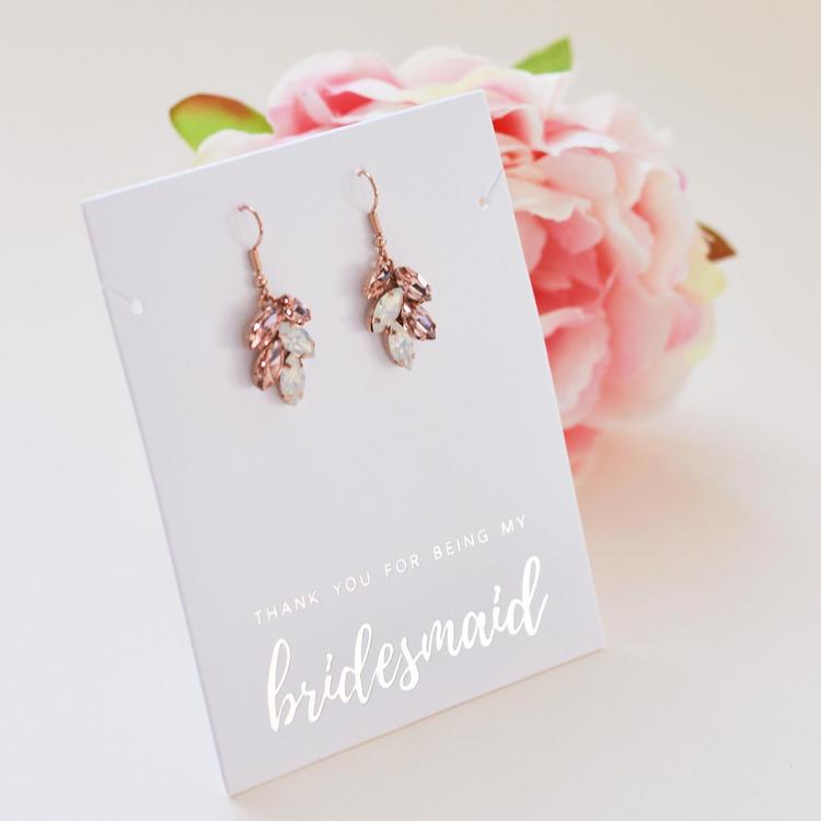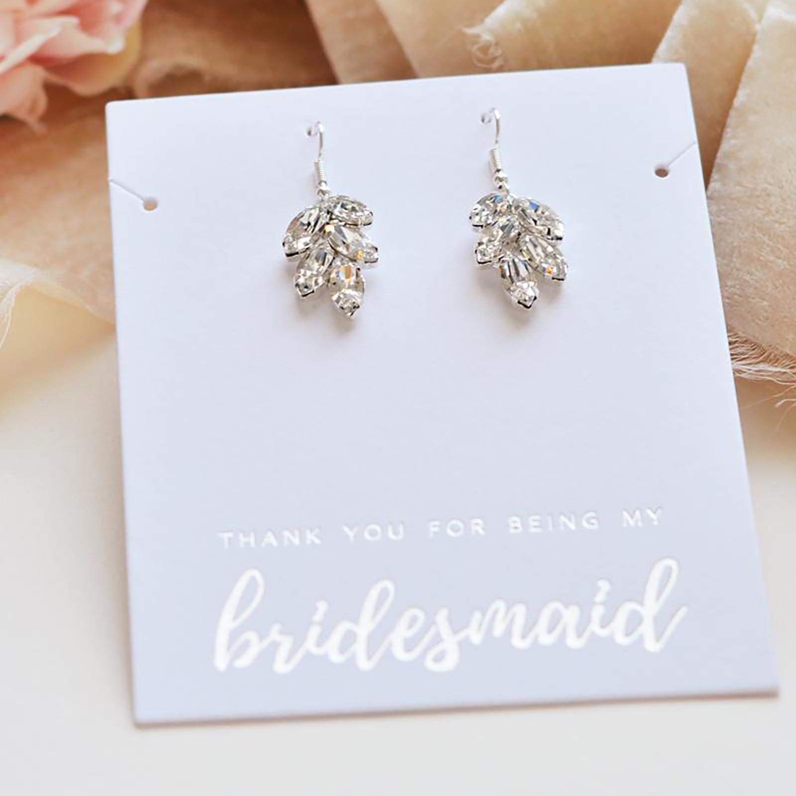 Giving this as a gift to your bridal party? Say thanks with this earring set which includes a card for your bridesmaids or maid of honor perfectly wrapped in a gift box. Crafted with the highest grade of crystals. The difference is visible. These crystals have more facets than others to maximize brilliance. Earrings hang delicately with a fishhook setting.