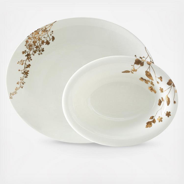 The Vera Jardin Serving Set will make a statement on the table, fusing style and functionality in one beautiful design. A white backdrop is decorated with shimmering gold and bronze floral accents, crafted into two serving pieces - an Open Vegetable Bowl and Oval Platter - that are perfect for dinner parties and hosting. Presented in a stylish signature Vera Wang Wedgwood gift box ideal for weddings, anniversaries and many other occasions.