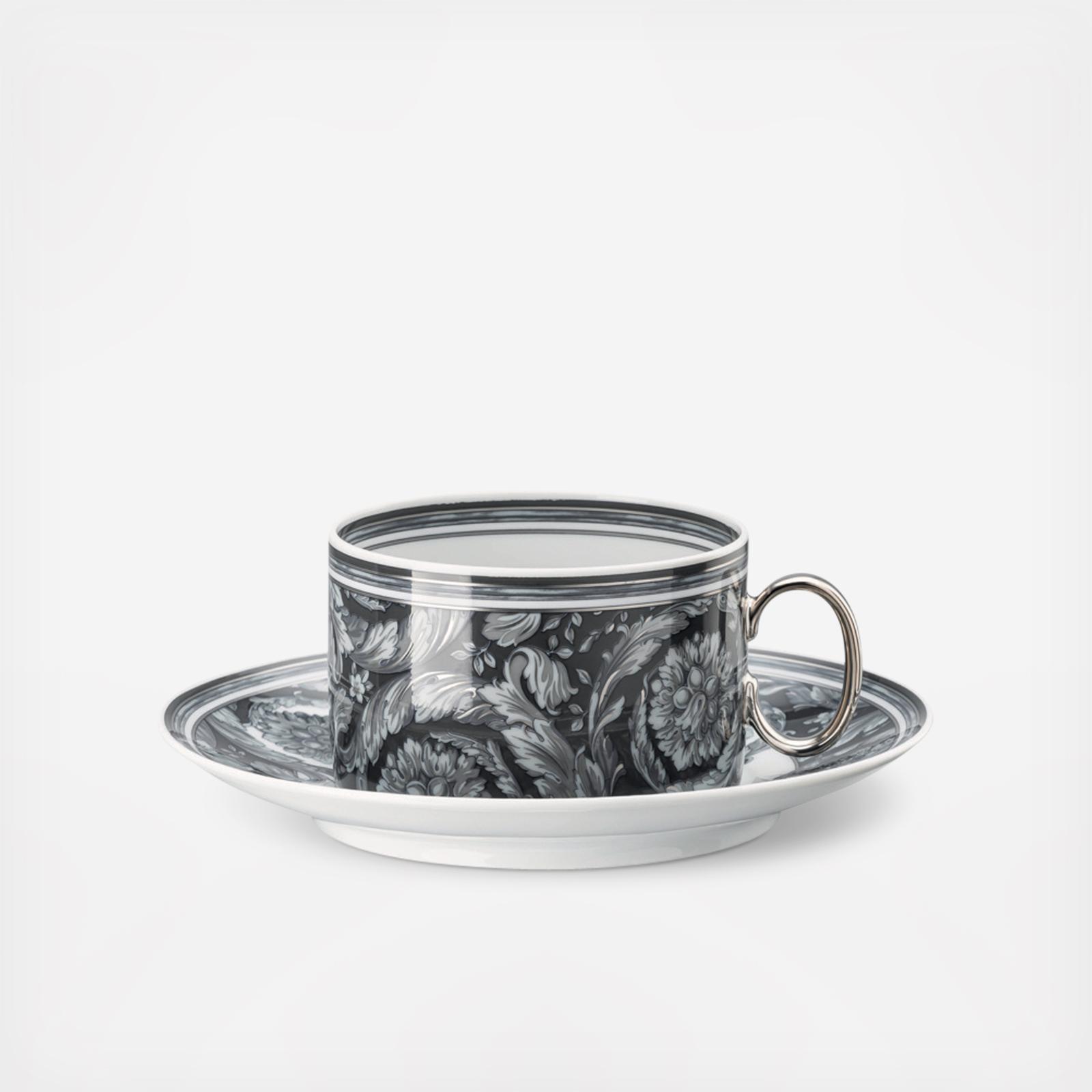 The Barocco Tea Cup & Saucer flowers and plants, gracefully depicted on high-quality porcelain, find their visual representation in the new tableware collection by Rosenthal meets Versace, Barocco.