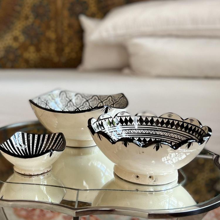 Your kitchen has found a new treasure with this set of 3 serving bowls. Beautifully combining visual appeal and practicality, the stunning, hand-painted geometric designs and modern shapes are sure to get people talking at your next dinner party. Storage is easy too, as each bowl fits within another - not that you'd ever want to hide these beauties. Handmade and handpainted by artisans in Safi, where artisans have made stunning ceramics for centuries. Made in Morocco.