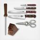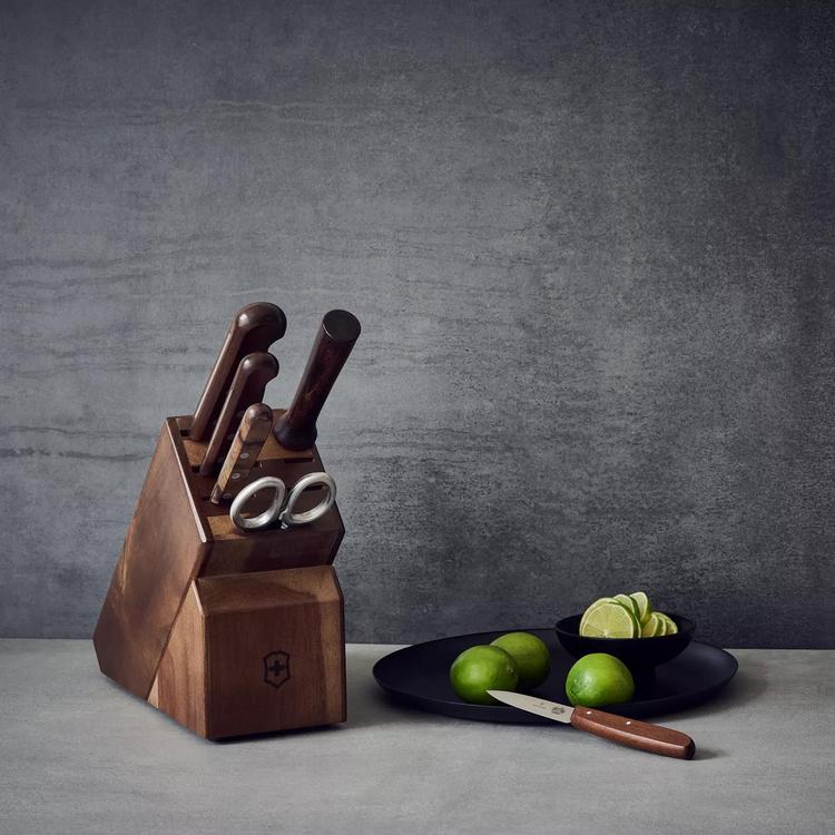 Restaurant quality Victorinox 7 piece knife block set takes the effort out of kitchen prep from cleaning and cutting to dicing and mincing. Authentic rosewood handles are hand finished and polished and specially treated with natural oils for a lifetime of minimal care. Over time, the rosewood's natural darker wood grain and varying hues increase in beauty. Victorinox kitchen cutlery is beautifully balanced and perfectly weighted for easy handling and firm cutting control. Precision-stamped from high carbon stainless steel, the blades are hand honed for razor sharpness. Swiss manufactured with the same outstanding quality standards of the Original Swiss Army Knife. Hand wash the Victorinox 7 piece knife block set. Lifetime warranty. Victorinox has expertly crafted knives in Switzerland since 1884. Lightweight to prevent hand fatigue and world renowned for quality blade edge retention, Victorinox knives are the leading brand of commercial use knives in the world.