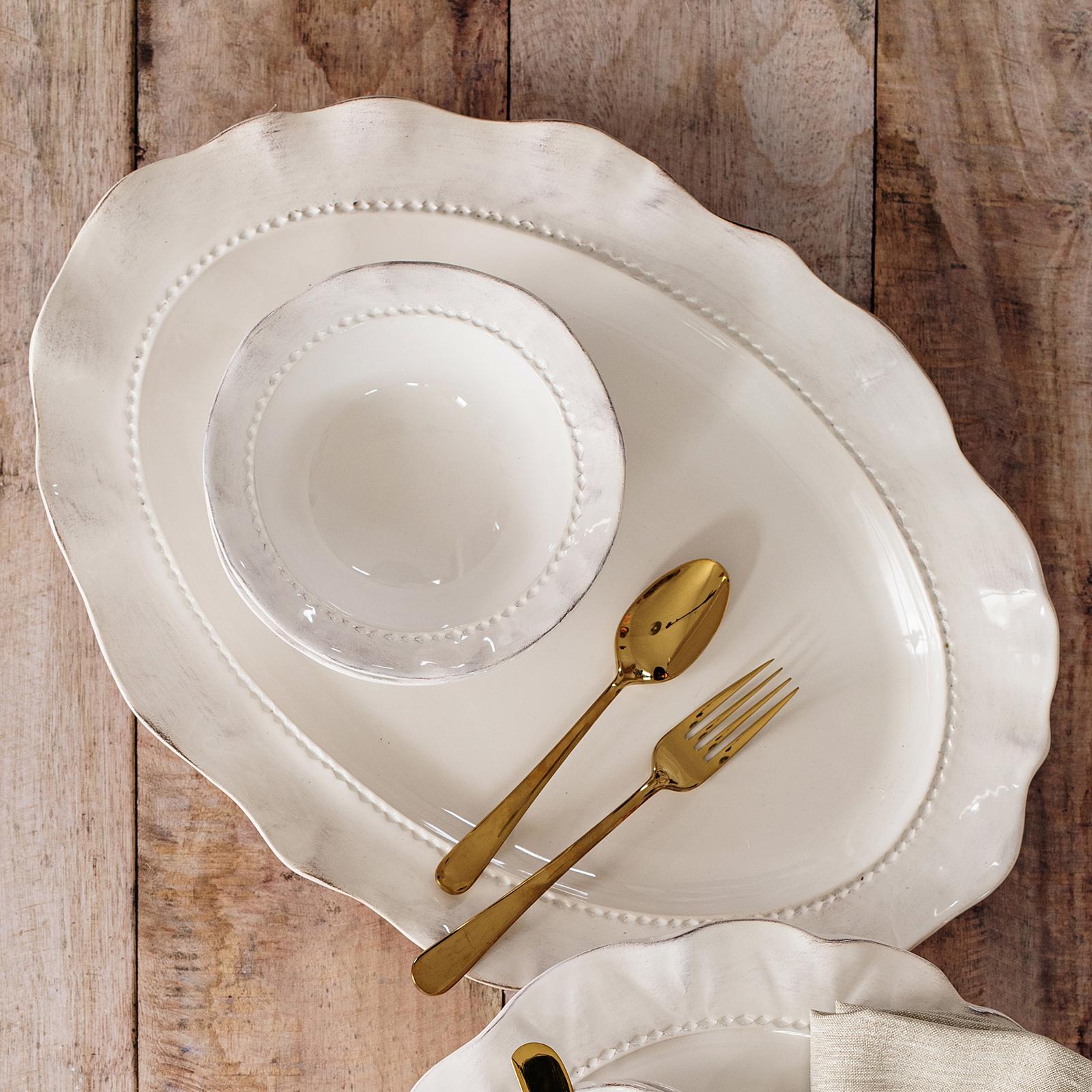 Both relaxed and refined, Giorno captures casually elegant Italian style. A wreath of precise etchings encircle each Giorno Oval Platter, and the nuanced glazing brings patina to each piece.