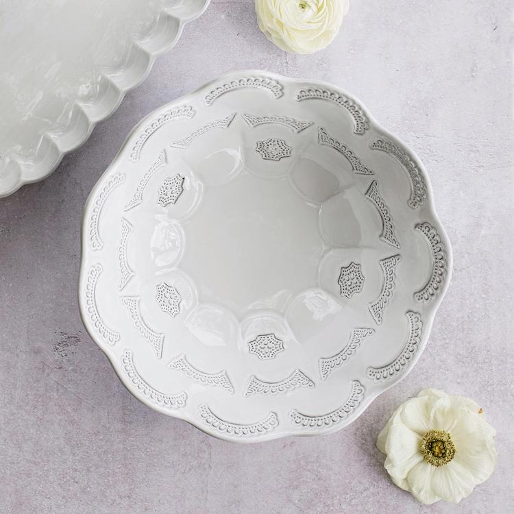 Italian for enchantment, Incanto is inspired by Italy's art, landscape, and Venetian history. The intricate design on the Incanto Lace Medium Round Bowl pays homage to the famed lace of Venice’s Burano island. This bowl is a must-have for entertaining or displaying, bringing a timeless and elegant touch to any setting.