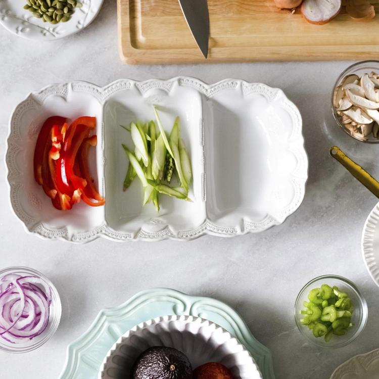 Italian for enchantment, Incanto is inspired by Italian art, the landscape, and Venetian history. The intricate designs on the Incanto Stone White Lace Medium Three-Part Server pay homage to the famed lace of Venice’s Burano Island. This piece is a delightful way to serve a trio of nuts, a selection of berries, or an assortment of candies.