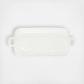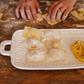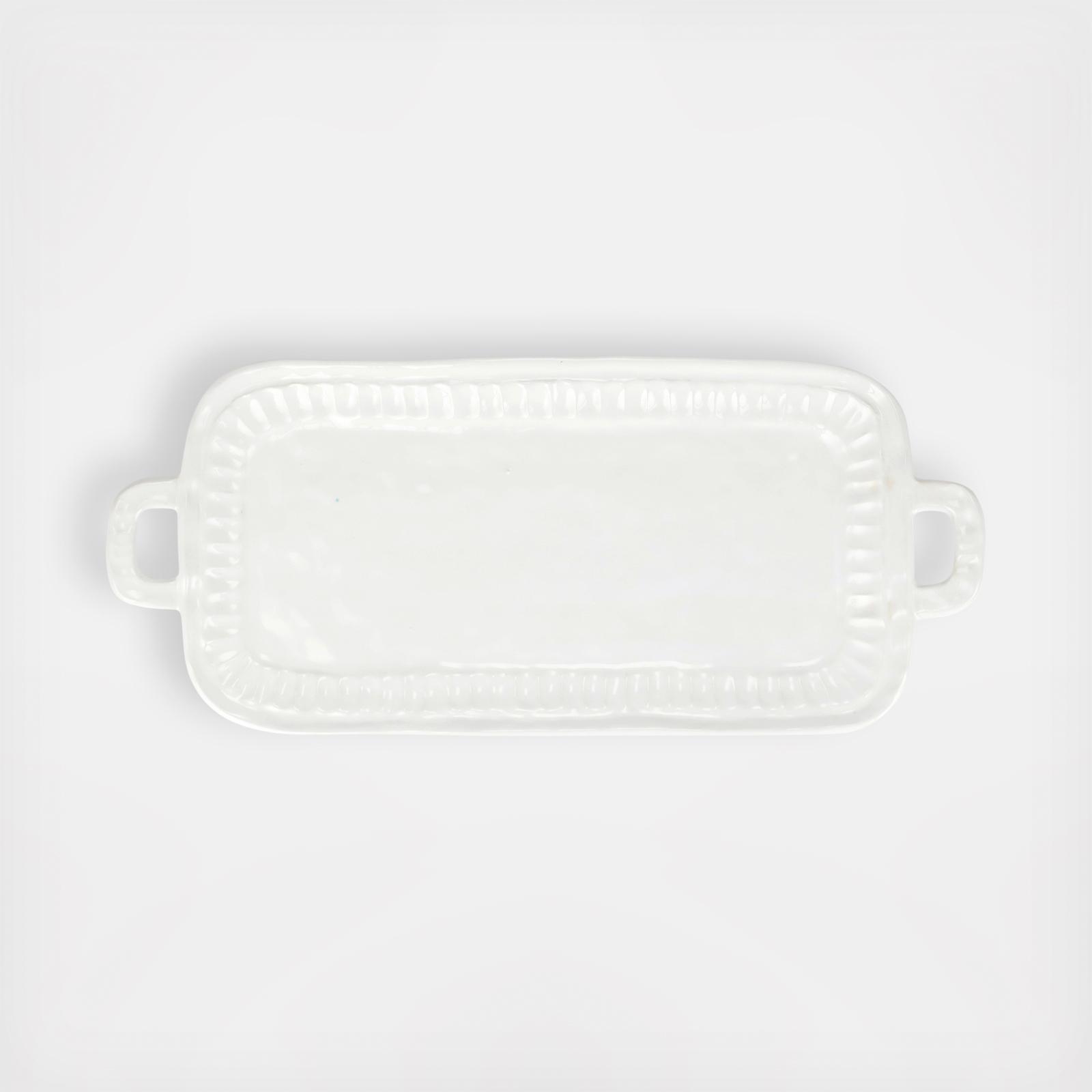 Pietra Serena, meaning serene stone, represents the simplistic beauty of the handpressed design found on the Pietra Serena Handled Rectangular Platter.
