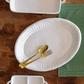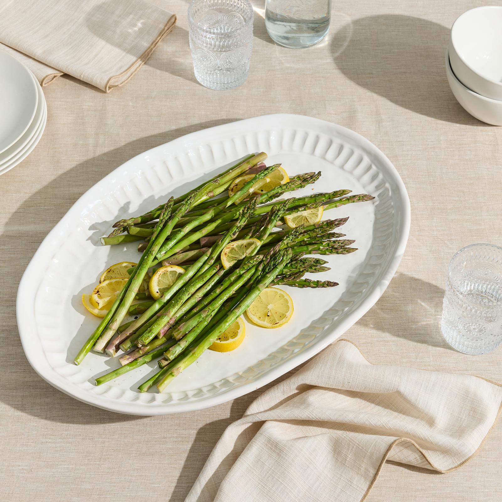 Pietra Serena, meaning serene stone, represents the simplistic beauty of the handpressed design found on the Pietra Serena Oval Platter.