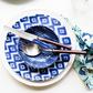 Recreate the beautiful mosaic tiles found in the Greek Isles with the Santorini Condiment Bowl, painted on hard ceramic in a fun blue and white pattern.