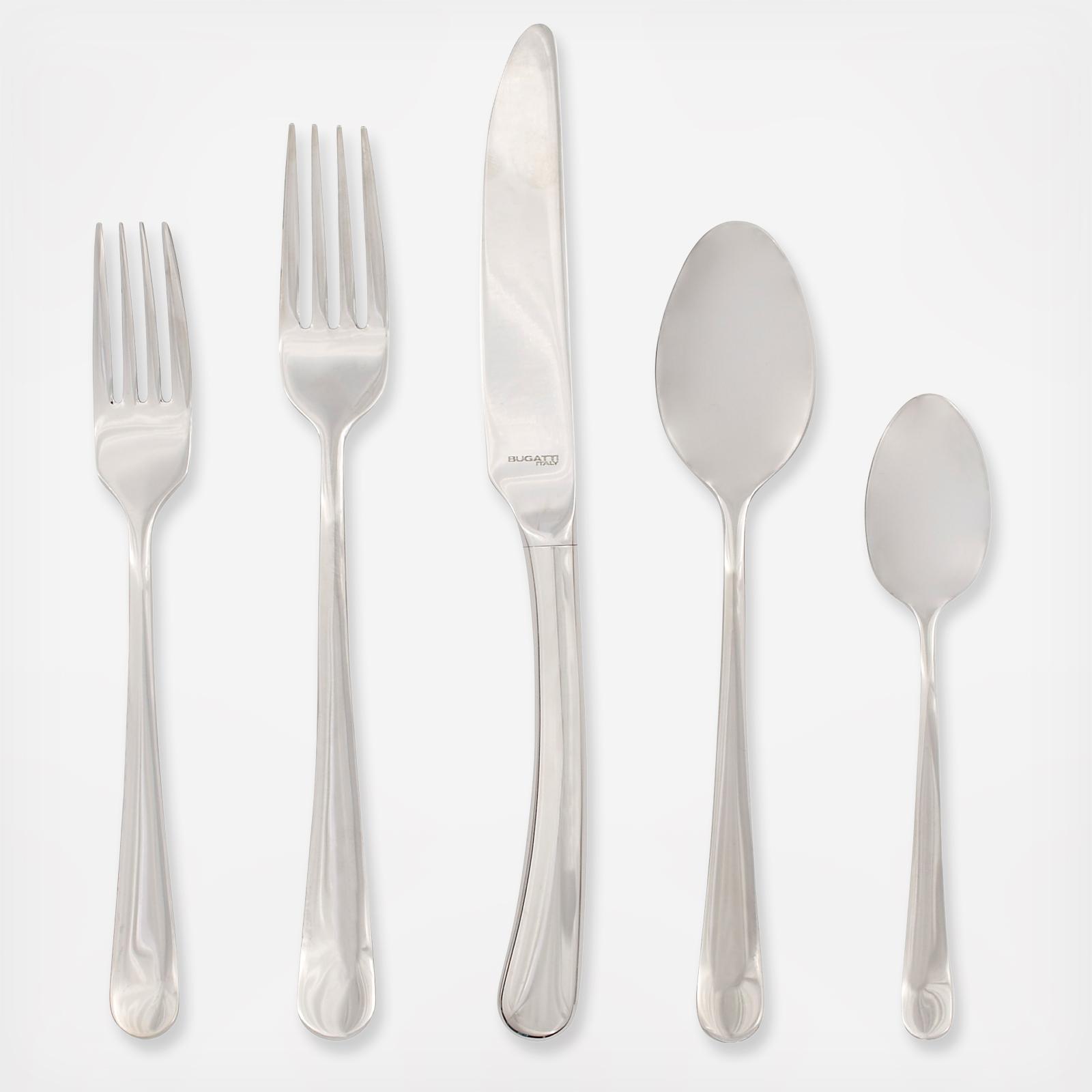 Soft, elegant lines grace each piece of the Settimocielo Five-Piece Place Setting. Translated "seventh heaven," an emphasis on balance and comfort is prevalent with this design. The knife is hollow-handled with a forged blade for cutting precision.