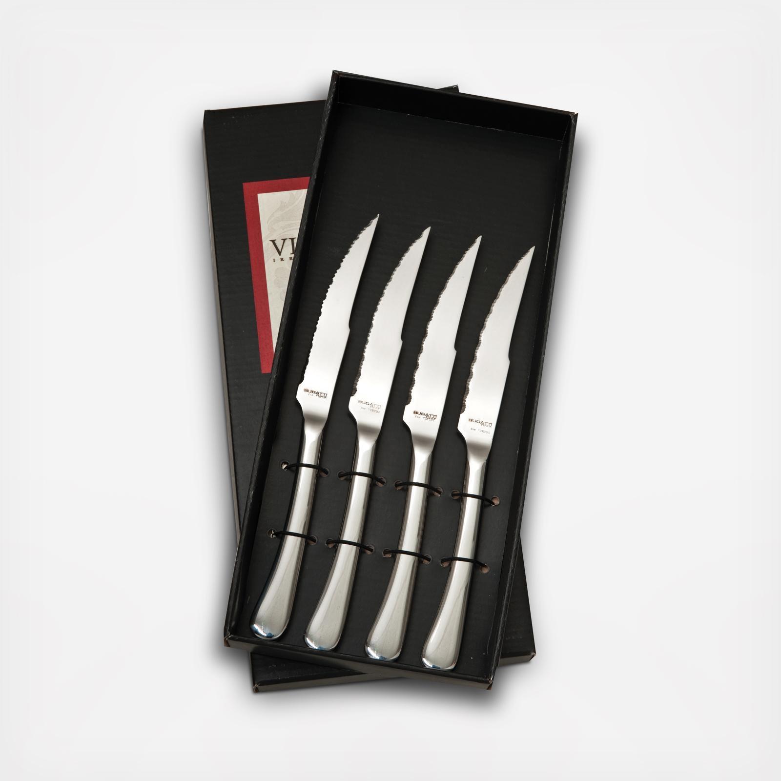 The Settimocielo Steak Knives with graceful lines, features a hollow-handled knife that has a forged blade for cutting recision.