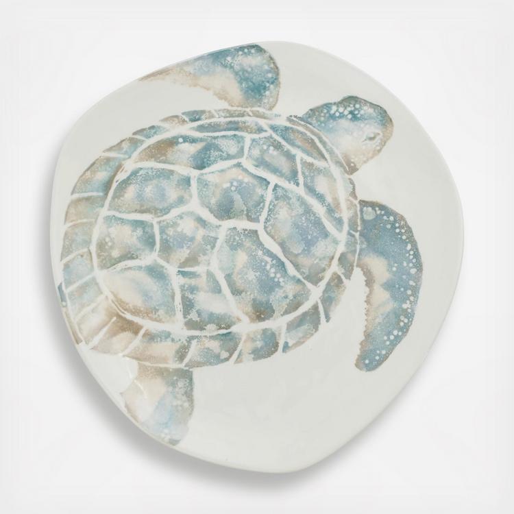 The handpainted sea turtle is rendered in hues of aqua and taupe against a clean, white canvas on the Tartaruga Oblong Serving Platter. Maestro artisan, Gianluca Fabbro, utilizes a unique sponging technique to carefully add detail to each piece.