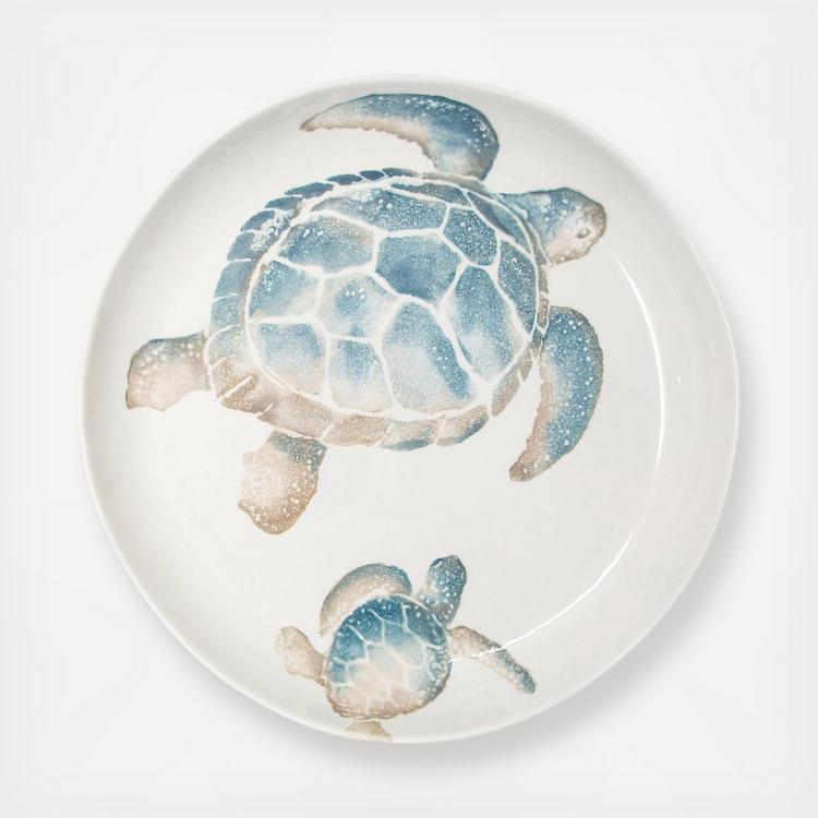 The handpainted sea turtle is rendered in hues of aqua and taupe against a clean, white canvas on the Tartaruga Round Shallow Bowl. Maestro artisan, Gianluca Fabbro, utilizes a unique sponging technique to carefully add detail to each piece.