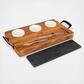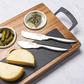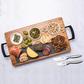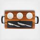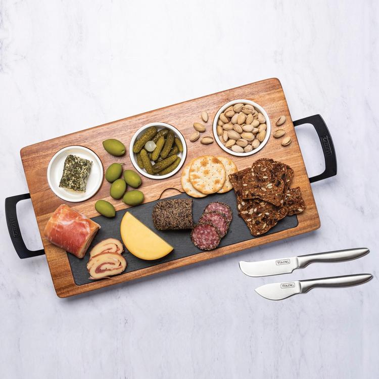 This 7-Piece charcuterie board set is an elegant way to impress your guests by serving a variety of appetizers on one board. The set includes a heavy-duty, sustainable, Acacia wood butcher block style serving board with ergonomic metal handles that make it easy to carry and maneuver while entertaining. Three ceramic ramekins sit into recessed holes on the board for dips, dried fruits, olives, nuts, gherkins, grapes, sauces, and anything else you may want to add to your presentation. The slate board is removable and perfect for both hard and soft cheeses and meats. You can even write the name of the cheese on the slate board with chalk (not included) so that your guests know the different types of cheeses you are offering. Underneath the slate board are two multi-function stainless steel cheese knives that are designed for both cutting hard cheeses as well as spreading soft cheeses and other spreads. The knives are conveniently stored under the slate board, we encourage you to use caution when moving the board so that the slate piece and ramekins don't fall out during movement or storage.