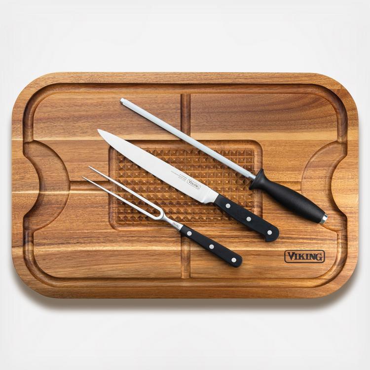At nearly two full feet long, the Viking Acacia Oversized Carving Board features an extra-large surface to stylishly accommodate family-sized proteins for large meals. The board is perfect for slicing and serving meats from the dining table. The diamond center secures meats in place while juice groves prevent any juices from spilling onto your table. Its 1.25-inch thickness not only makes it strong and sturdy, but also nicely stages your turkey or roast with some height.