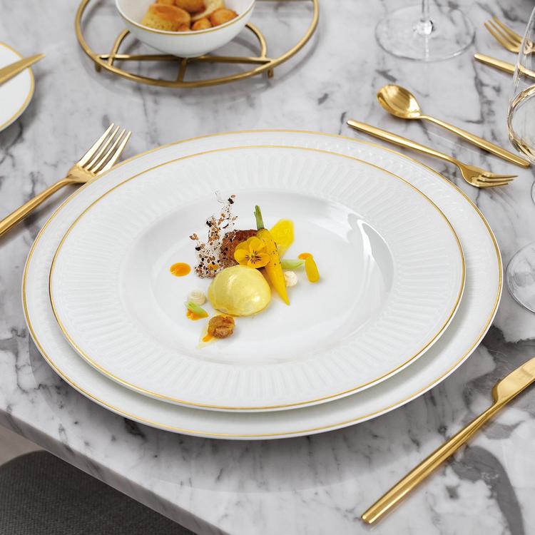 In the new collection, Château Septfontaines Villeroy & Boch combines design aspects from its own history with high-end materials and the latest production techniques to create exquisite tableware. This has resulted in the creation of an exciting interplay of matte and glossy surfaces. The 20-karat gold rim is dishwasher safe thanks to a new innovative technology. The subtle play of matte and gloss gives this setting a graceful and elegant appearance. Perfect for lovers of classic fine dining.