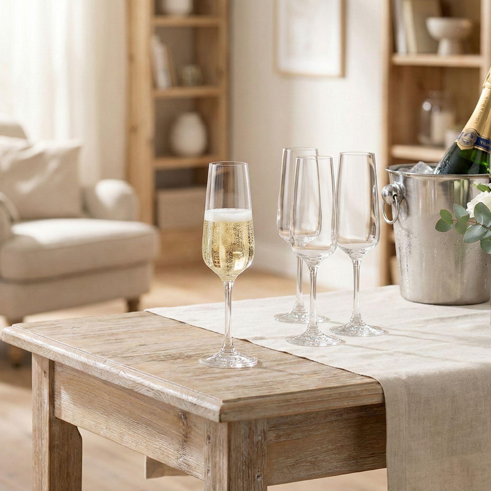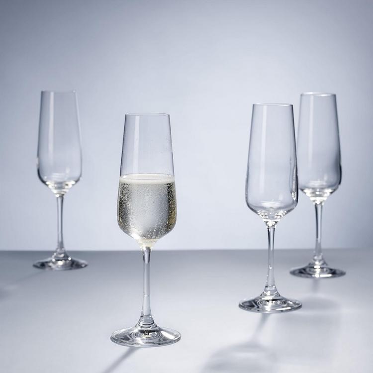 Cheers to celebration in style with these Ovid Champagne Flutes! Made in Germany of crystal glass, these champagne flutes are the height of class and functionality. Includes:- Four 8.5 oz. Crystal glasses