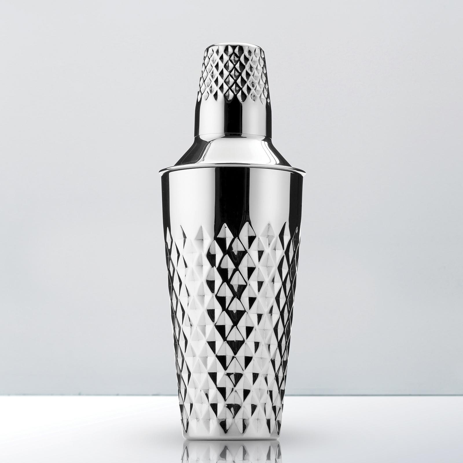 Divited with diamond shapes to catch light and eyes atop any bar, the shiny-bright diamond cocktail shaker grips comfortably with minimal coldness in your hand thanks to its textured design.